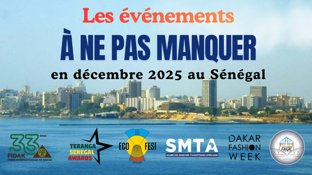 Les grands événements de décembre au Sénégal. Tout savoir sur les événements incontournables à ne pas manquer au mois de décembre. Décembre au Sénégal, ce n’est pas seulement la fin d’année : c’est le mois des grandes fêtes, des salons et des festivals. De la Foire internationale de Dakar aux parades lumineuses du Fanal à Saint-Louis, en passant par la mode avec la Dakar Fashion Week, découvrez les temps forts à ne pas manquer pour vivre toute la richesse culturelle du Sénégal en cette période . ▪️Festival ECO FEST▪️Teranga Sénégal Awards▪️Foire Internationale de Dakar▪️Salon des Marchés Touristiques Africains▪️Dakar Fashion Week▪️Fanal de Saint-Louis ⭐Festival ECO FEST Festival ECO FEST Festival Ouest Africain Arts & Culture, un rendez-vous majeur dédié à la diversité culturelle, à la création artistique et à la valorisation des patrimoines ouest-africains. Au programme : concerts, exposition d’art, concours artistiques, cinéma, spectacles vivants 📅Du 30 novembre au 6 décembre 📍Dakar (Grand Théâtre, Monument de la Renaissance Africaine, Place du souvenir, galerie Nationale, centre culturel…) ✅Plus d’infos ici ⭐Teranga Sénégal Awards 2025 ⭐Teranga Sénégal Awards 2025 3e édition de la grande rencontre des acteurs touristiques et culturels organisée par la journaliste Kewe Sène. Au programme : Expo-vente, panels, soirée de gala, remise de distinctions, concert et présence de nombreux partenaires et institutions 📅5-6 décembre 📍Dakar, Hôtel Pullman Teranga ✅Plus d’infos ici ⭐Foire Internationale de Dakar ⭐Foire Internationale de Dakar 33e édition de la FIDAK organisée au CICES de Dakar sous le thème Transformation territoriale et développement inclusif. 16 000m2 d’espaces dédiés à l’agriculture, à l’ingénierie, aux technologies, à la construction, aux médias, à l’artisanat et bien plus encore. 📅7-31 décembre 📍Dakar, CICES ✅Plus d’infos ici ⭐Salon des Marchés Touristiques Africains (SMTA) ⭐Salon des Marchés Touristiques Africains (SMTA) Première édition de ce grand salon dédié au tourisme africain organisé par l’ASPT avec pour thème : Tourisme, Culture, Artisanat d’Arts et Transports Aériens Au programme : expositions des produits touristiques mondiaux, animations culturelles et gastronomiques, conférences, panels et tables rondes sur le financement du tourisme, forum sur le tourisme halal, conférence internationale sur la croisière et rencontres professionnelles et sessions de networking B to B 📅8-11 décembre 📍Dakar, esplanade du Grand Théâtre de Dakar ✅Plus d’infos ici ⭐Dakar Fashion Week 2025 ⭐Dakar Fashion Week 2025 Un défilé spectaculaire organisé cette année sur l’île de Ngor avec des mannequins qui évolueront sur l’eau, en communion avec la nature et les symboles du Sénégal. 📅3-7 décembre 📍Dakar, île de Ngor ✅Plus d’infos ici ⭐Festivités du Fanal de Saint-Louis ⭐Festivités du Fanal de Saint-Louis Un rendez-vous culturel annuel organisé par Jallone Production, avec pour thème « Valeurs culturelles et entreprenariat » Au programme : Parade et défilé en tenue traditionnelle, spectacle son et lumière, concertsvillage culturel, anmations pour enfants 📅24-31 décembre 📍Ville de Saint-Louis ✅Plus d’infos ici Vous avez aimé notre article « Les grands événements de décembre au Sénégal » ? Retrouvez plus de 200 autres articles sur notre blog Notre dernier article