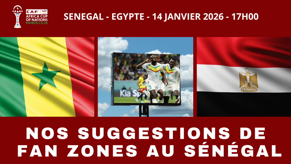 FAN ZONE : Où regarder la finale Sénégal-Maroc ? Découvrez nos suggestions d’endroits pour supporter l’équipe nationale et profiter d’une ambiance de fête ! SOMMAIRE : ◾Dakar◾Petite Côte Le Sénégal brille pendant la Coupe d’Afrique des Nations 2025 avec sa qualification pour les demi-finales ! Retrouvez les lieux incontournables pour suivre les Lions du Sénégal en direct et vibrer en famille ou entre amis dans des fan zones dédiées ! Ambiance 100% supporter garantie pour vibrer, rêver et s’amuser ! Dakar ⭐Institut Français de Dakar En partenariat avec la RTS, l’institut français de Dakar diffusera la demi-finale Sénégal – Egypte. Animation à partir de 15h (défi Car Rapide ), places de cinéma à gagner ! ✅Entrée gratuite et diffusion sur grand écran📍80 rue Joseph Gomis, Dakar ⭐CICES – Foire Internationale de Dakar A l’occasion de la Foire Internationale de Dakar, le CICES propose au sein de la FIDAK, une fan zone spéciale pour venir supporter l’équipe du Sénégal. Suivez la demi-finale des Lions sur écran géant et profitez d’une ambiance festive ! ✅Entrée libre📍CICES, Dakar ⭐Place de la Nation – Dakar Un place publique avec écran géant pour vibrer de manière populaire lors de cette finale ! ⭐Monument de la Renaissance Africaine – Dakar ⭐Noom Hôtel Retransmission des demi-finales de la CAN sur écran géant au Pool Bar. Package avec tapas et boissons incluses ✅A partir de 20 000 fcfa par personne📍Noom Hôtel Dakar ⭐La Favela Diffusion des matchs de la demi-finale avec 6 écrans géants, animation DJ et ambiance. 📍Point E, Dakar💸Différentes formules à partir de 5000 fcfa / personne ⭐Cinéma Pathé Dakar Diffusion du match, en partenariat avec la RTS avec une Fan zone cinéma. Ambiance de stade et son immersif ! 📍Mermoz, Dakar💸 Tarif unique de 5000 fcfa, réservation sur place ou sur le site Internet Petite Côte ⭐RDC Saly Fan zone, écran géant, son et lumière et ambiance festive pour la finale Sénégal-Maroc (réservation obligatoire) 📍Saly ⭐Royal Baobab Diffusion du match Sénégal – Egypte dans une ambiance conviviale et festive. Buffet et boissons à volonté ! 📍Somone💸Night pass 17h-02h : 25 000 fcfa📩Réservation : contact@newhorizonshotels.com Vous avez aimé l’article « FAN ZONE : Où regarder les matchs du Sénégal pendant la CAN ? » Retrouvez plus de 200 articles sur le tourisme au Sénégal dans notre blog référence