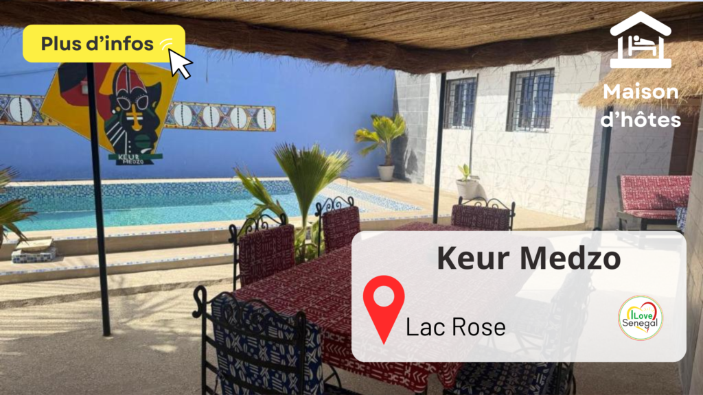 Description de Keur Medzo Keur Medzo est une maison d’hôtes paisible située à 150 m du lac Rose, idéale pour se ressourcer loin de la foule. Elle peut accueillir jusqu’à 16 personnes dans 6 chambres climatisées avec salle de bain privée, TV et Wi-Fi. La villa comprend une maison principale et une dépendance. Les visiteurs profitent aussi d’une piscine, d’une grande terrasse ombragée et de plusieurs espaces conviviaux pour se détendre. La chambre de deux personnes est partir de 30 000 FCFA (45€) avec petit déjeuner inclus. Laure et Mouhamadou, les hôtes accueillants, proposent également un service de restauration, la mise à disposition d’un guide et la traditionnelle balade en quad autour du lac rose. Une adresse de qualité que nous recommandons volontiers à nos lecteurs, offrant des tarifs accessibles et tout le charme de l’accueil chaleureux d’une maison d’hôtes. .📍Niaga, Lac Rose⭐A proximité : Lac Rose, océan📞+221 78 663 41 44📩keur.medzo@hotmail.com 💸Sélectionnez vos dates et réservez votre chambre sur le site Internet ___Retrouvez notre sélection des meilleurs hébergements au Sénégal selon plusieurs thématiques.