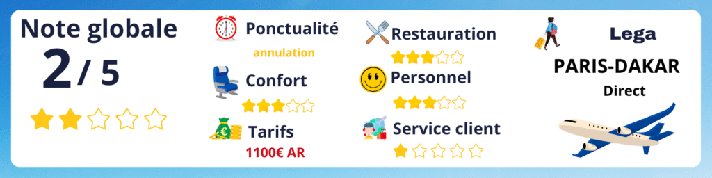 💬Commentaire : « Personnel à bord très professionnel, aimable et réactif. Après, c’est une compagnie low-cost, la confort est plus que moyen, espace très réduit et TOUT est en supplément. Les repas, chers, et tout ce qui est proposé sur la brochure n’est pas toujours disponible. Maintenant, je prévois toujours d’acheter un sandwich/repas, avant d’embarquer. Le seul intérêt, c’est les vols réguliers et les prix « attractifs » car il y a peu d’alternatives sur des vols directs. Air Sénégal, souvent bien plus cher et extrêmement peu de vols Marseille-Dakar disponibles à la réservation à 4 mois. Air France, outch….. Bien plus onéreux. »