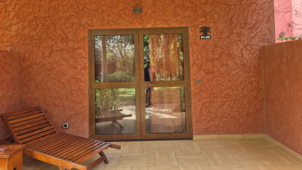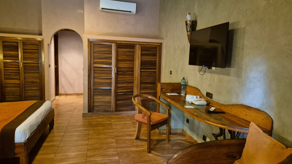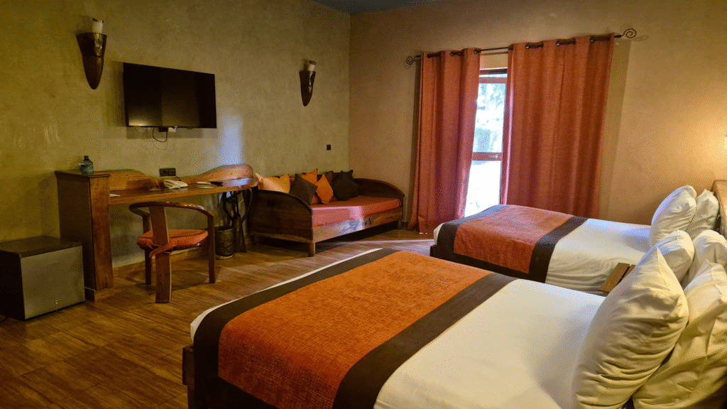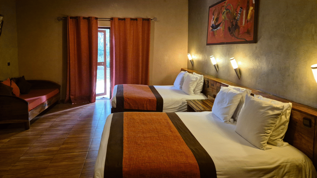 La chambre, familiale est propre (j’ai attendu pour ça 😁), bien agencée. Il y a deux lits doubles, un canapé, un espace bureau, deux grandes armoires, une télévision, une décoration simple mais agréable et une climatisation plutôt efficace (important en cette période d’hivernage).