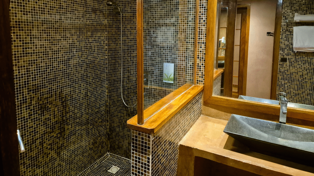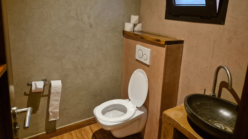 Sans oublier des toilettes et une salle de douche propres également. La chambre dispose d’une petite terrasse avec deux transats. Le wifi est disponible avec un petit code que la réception m’a remis lors de l’enregistrement.