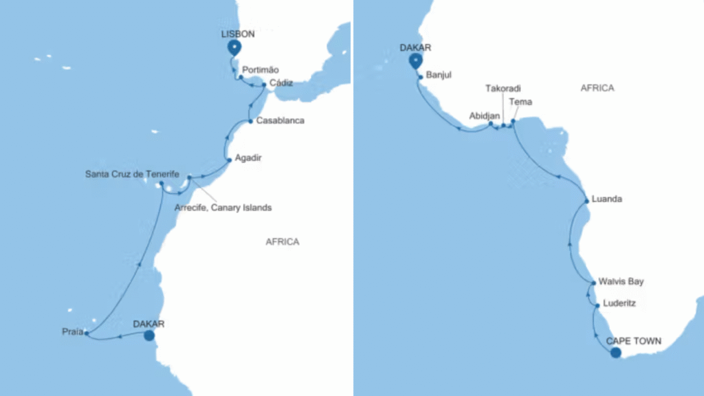 Les navires qui font escales à Dakar proposent à leur client différents itinéraires, avec régulièrement une croisière le long du littoral africain, depuis l’Europe ou l’Afrique du Sud. Casablanca, Praia, Abidjan ou Luanda font partie des escales très prisées des visiteurs.