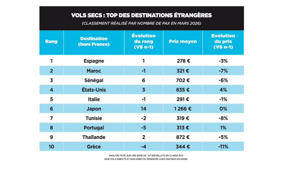 Régulièrement, Digitrips publie un baromètre des réservations de vols depuis l’hexagone. Le Sénégal se distingue au mois de mars 2026, puisqu’il figure 3e dans le classement des destinations étrangères en vols secs.