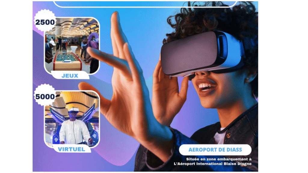 Toujours en salle d’embarquement, un espace dédié à la réalité virtuelle est ouvert aux passagers, proche du point de restauration Planet Kebab. Fauteuils de réalité virtuelle, simulateur de vols, babyfoot, flippers, cet endroit permet de se détendre, avec ses sessions entre 3 et 7 minutes. Le simulateur de réalité virtuelle est à 5000 fcfa et les jeux sont à 2500 fcfa