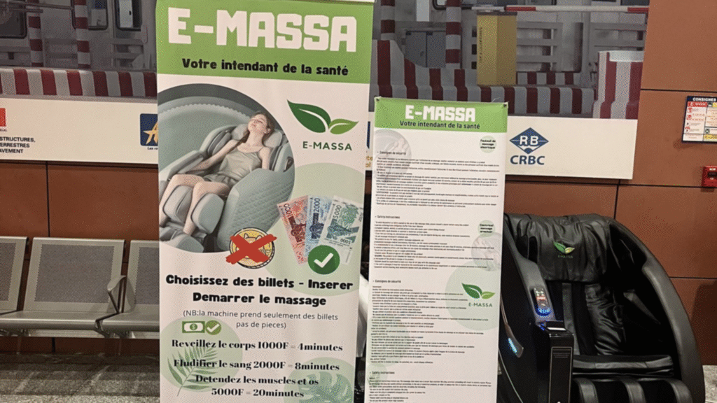 Les fauteuils E-MASSA se trouvent à côté des points de restauration Planet Kebab et Mama Pizza. La session est à 1000 fcfa les 4 minutes, 2000 fcfa les 8 minutes et 5000 fcfa les 20 minutes.