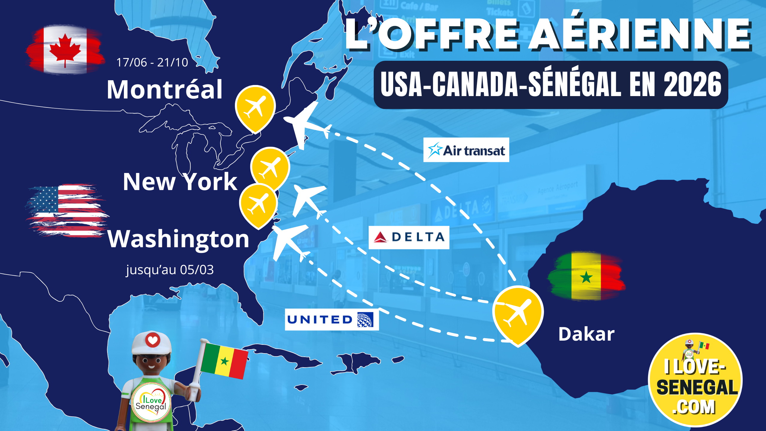Les vols USA Canada vers le Sénégal en 2026. Quelle offre aérienne vers le Sénégal ? Quelles compagnies pour Dakar depuis le Canda ou les Etats-Unis ? Toutes les options dans notre article.
