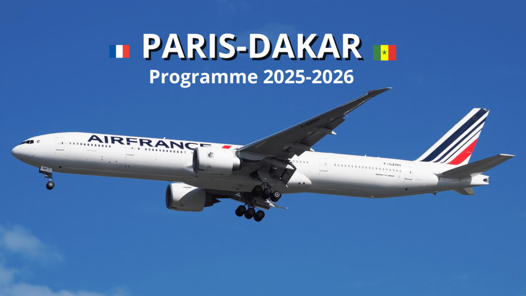 Le programme de vol Air France au Sénégal pour la saison 2025-2026. La compagnie renforce son offre pour les fêtes de fin d’année avec l’ajouts de vols, en plus de sa liaison quotidienne depuis Paris Charles de Gaulle. ⭐Horaires et fréquences Les vols Air France vers le Sénégal s’opérèrent habituellement 1 fois par jour depuis le terminal 2 F ou 2G de l’aéroport Paris Charles de Gaulle. Vol Aller CDG- DSS📅Quotidien🛫Départ Paris⏰15:45 🛬Arrivée Dakar ⏰20:35 Vol retour DSS – CDG📅Quotidien🛫Départ Dakar⏰23:15🛬Arrivée Paris ⏰05:50 Pour les fêtes de fin d’année, Air France renforce son offre et desservira Dakar avec un vol supplémentaire par jour aux dates suivantes : Vol Paris – Dakar : 16, 20, 21, 23, 27, 28, 30 décembre et 3, 4, 6, 10, 11 janvier Vol Dakar-Paris : 17, 21, 22, 24, 28, 29, 31 décembre et 4, 5, 7, 11, 12 janvier Les horaires sont les suivants : Vol Aller CDG- DSS🛫Départ Paris⏰22:15 🛬Arrivée Dakar ⏰03:00 Vol retour DSS – CDG🛫Départ Dakar⏰06:10🛬Arrivée Paris ⏰12:35 ⭐L’avion et les services Ces vols supplémentaires seront pour certains, effectués en Airbus A350 de dernière génération. Rappelons que les vols classiques quotidiens sont opérés en Boeing 777-300ER, en configuration 3 x 4 x 3 en classe économique. Tous les sièges sont équipés d’écrans individuels avec films et musiques. Repas et bossons sont inclus et un service de petit déjeuner est aussi proposé pour le vol retour Dakar-Paris. Nouveauté, le Wifi est désormais accessible en cabine gratuitement ! Vous arrivez au Sénégal prochainement ? Retrouvez notre article complet sur les services à l’aéroport Blaise Diagne, les hébergements selon vos critères et les guides ou transferts aéroport. ⭐Les types de tarif et les bagages Il existe plusieurs 4 classes de tarif en économique classique : Light, Light Plus, Standard et Flex avec des services différents sur les bagages et les services. 🟢Le Light : 1 bagage cabine classique, 1 petit sac et 1 bagage de 23kg en soute 🟢Le Light Plus : 1 bagage cabine classique, 1 petit sac et 1 bagage de 23kg en soute, siège à l’avant de la cabine 🟢Le Standard : 1 bagage cabine classique, 1 petit sac et 2 bagages de 23kg en soute et choix du siège gratuit 🟢Le Flex : 1 bagage cabine classique, 1 petit sac et 2 bagages de 23kg en soute et choix du siège gratuit, billet remboursable ⭐Mon astuce pour trouver vos vols au meilleur prix Les comparateurs de vols sont des outils indispensables pour réserver son billet d’avion vers le Sénégal. A titre personnel, j’utilise et recommande Skyscanner, l’un des meilleurs moteurs de recherche actuellement. Il vous permet de : ▪️Comparer les offres de vols de plus de 1 000 prestataires et choisir les billets les moins chers, ou les trajets les plus rapides ▪️Identifier le mois ou même le jour le moins cher pour vous envoler, puis créer des alertes de prix pour réserver quand le prix est le plus intéressant 👉🏿Faites votre recherche pour comparer ! Vous avez aimé l’article « Le programme de vol Air France au Sénégal » Retrouvez notre dossier spécial « Venir en avion au Sénégal » avec les programmes de vols les tests des compagnies aériennes et bien d’autres informations utiles sur votre voyage Les derniers articles Nos meilleurs articles