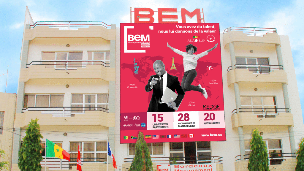 BEM Dakar, antenne africaine de Bordeaux École de Management (fondée en 1874), est implantée au Sénégal depuis 2008. Elle dispense des enseignements dans les domaines du commerce, de la gestion et du management, auprès des étudiants, des professionnels et des entreprise. Elle représente près de 27 programme de Managment avec plus de 200 professeurs.